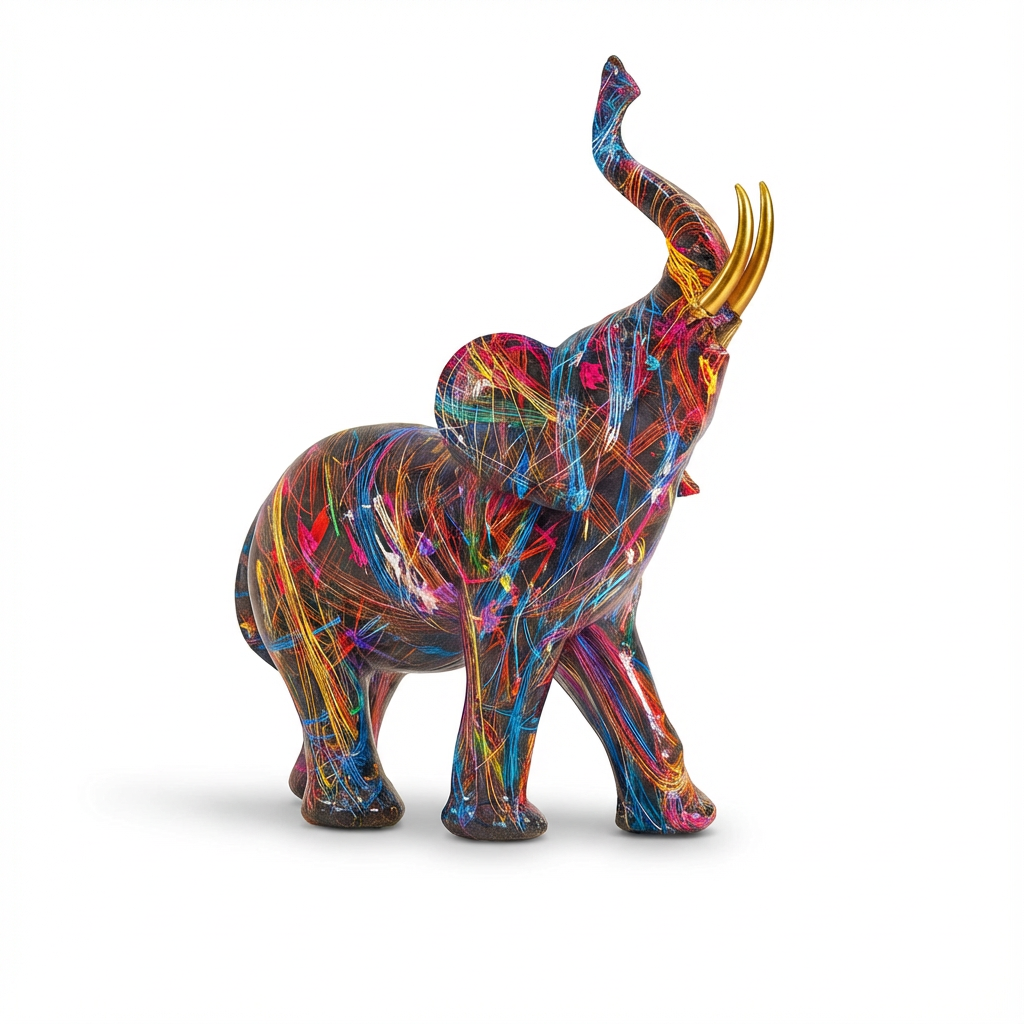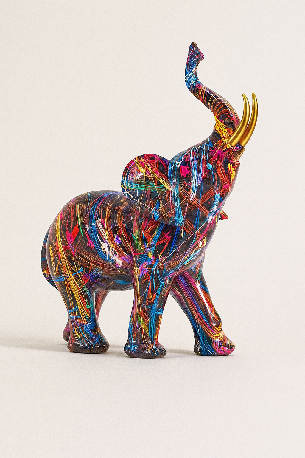 Avari to figurka dekoracyjna słonia, wykonana z trwałej żywicy i pokryta barwnym, ręcznie malowanym wzorem o dynamicznej strukturze.