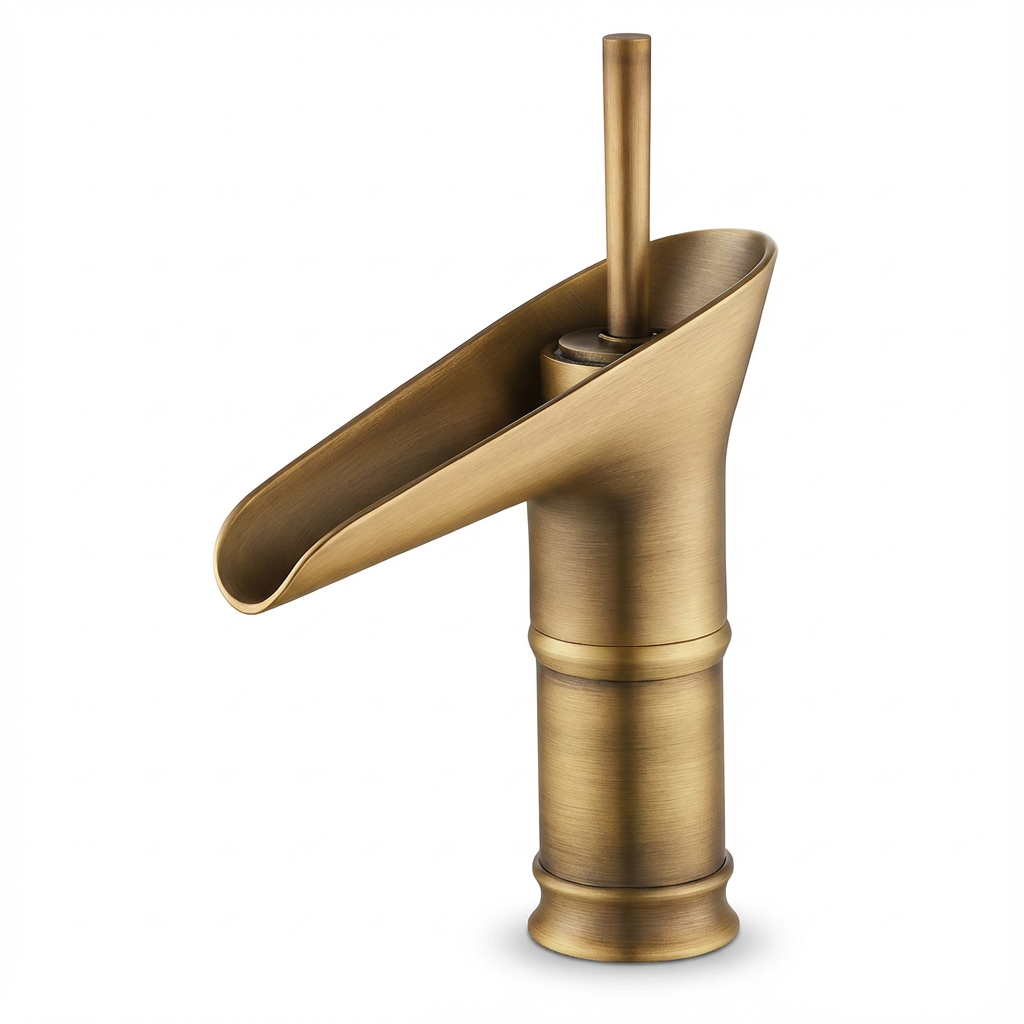 Jej retro forma i szczotkowane wykończenie z mosiądzu kontrastują z nowoczesną ceramiką, dodając przestrzeni charakteru.