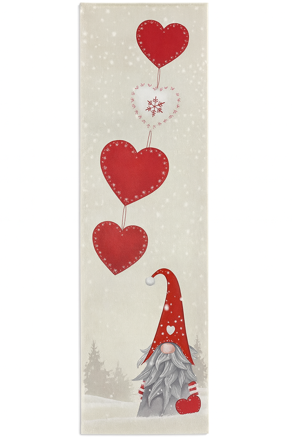 Wykonany z trwałej tkaniny o gęstym splocie, zdobiony jest ilustracją skrzata w czerwonej czapce otoczonego motywami serc i śnieżynek. Ciepła kolorystyka i subtelne detale sprawiają, że idealnie komponuje się z zastawą w naturalnych barwach i drewnianymi elementami. Doskonale sprawdza się podczas kolacji wigilijnej, zimowych spotkań z bliskimi czy jako sezonowa ozdoba codziennego stołu.