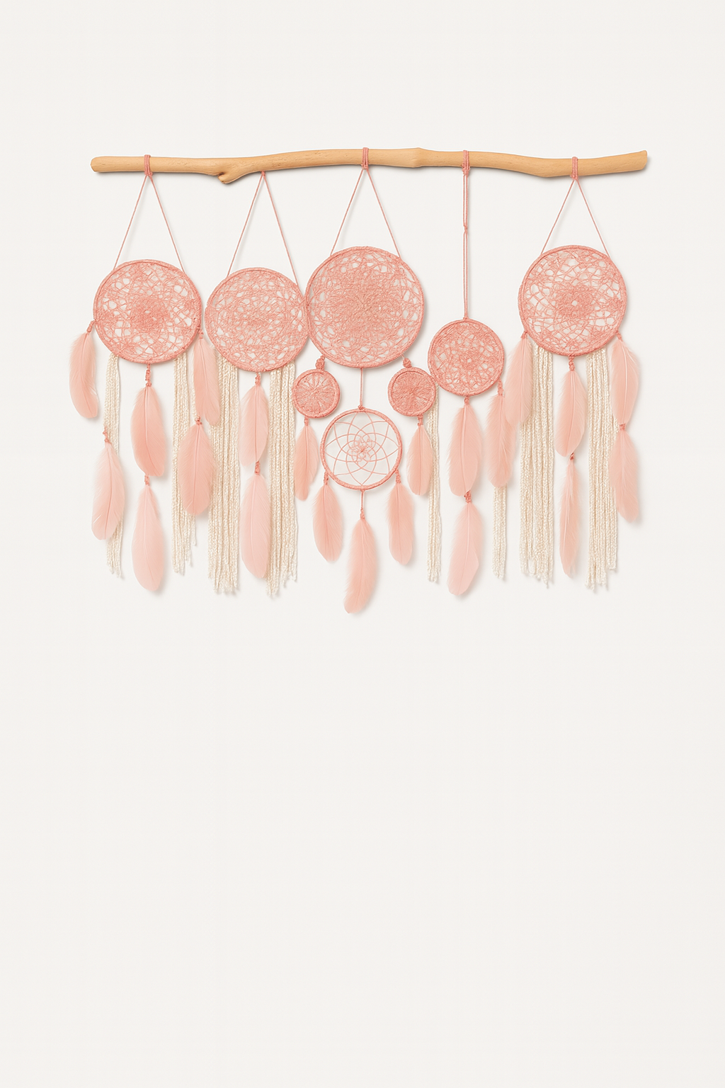 DreamWeave to ręcznie wykonany zestaw pięciu łapaczy snów, łączący tradycyjną symbolikę z artystycznym charakterem stylu boho.