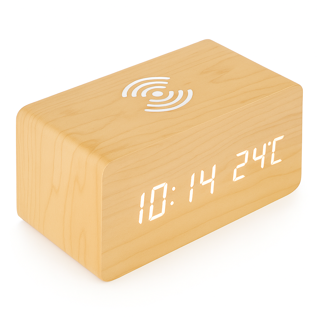 Wyświetla godzinę, datę oraz temperaturę (do wyboru °C lub °F). Dzięki funkcji ładowania bezprzewodowego 5W możesz naładować swój telefon bez kabli. Aktywuj tryb oszczędzania energii, a ekran włączy się po klaśnięciu lub stuknięciu.