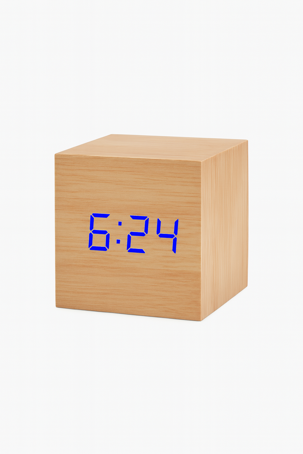 Ten sześcienny budzik LED łączy naturalną fakturę drewna z nowoczesnym, cyfrowym wyświetlaczem, tworząc subtelne i praktyczne uzupełnienie przestrzeni sypialni, biura czy salonu.