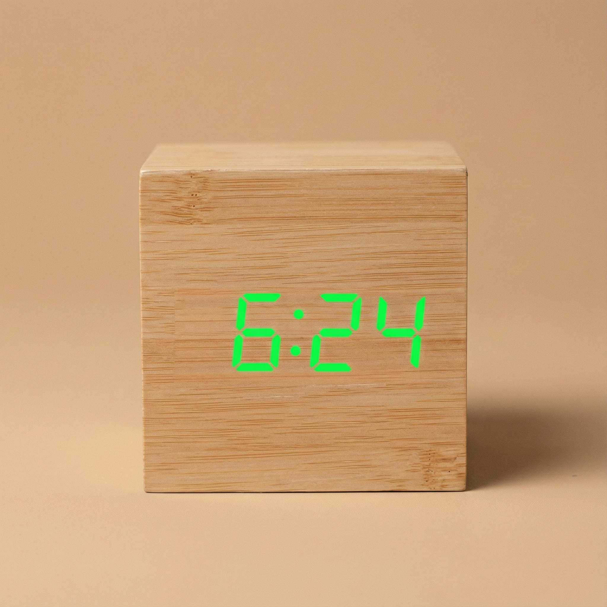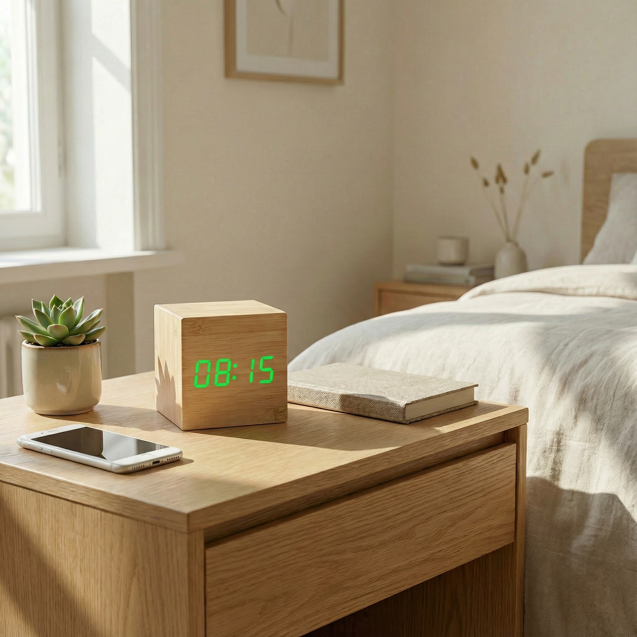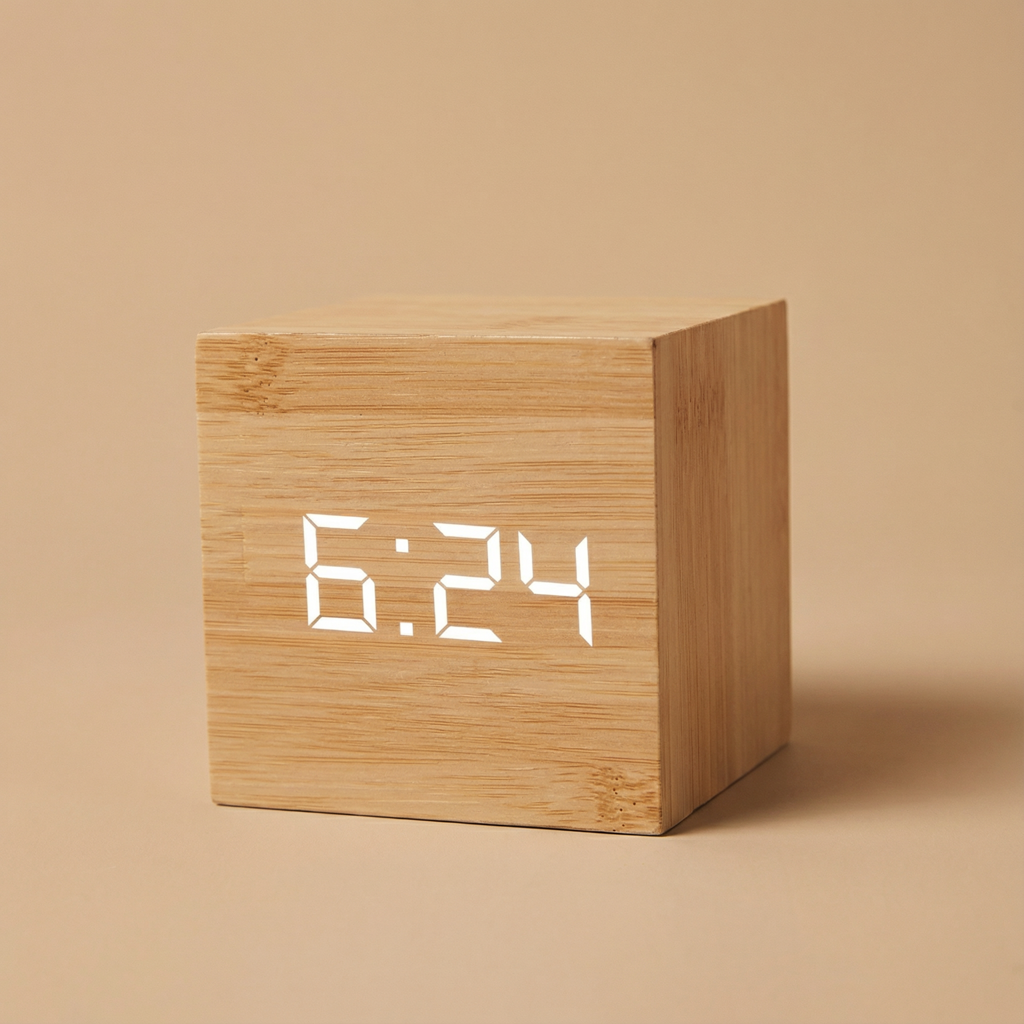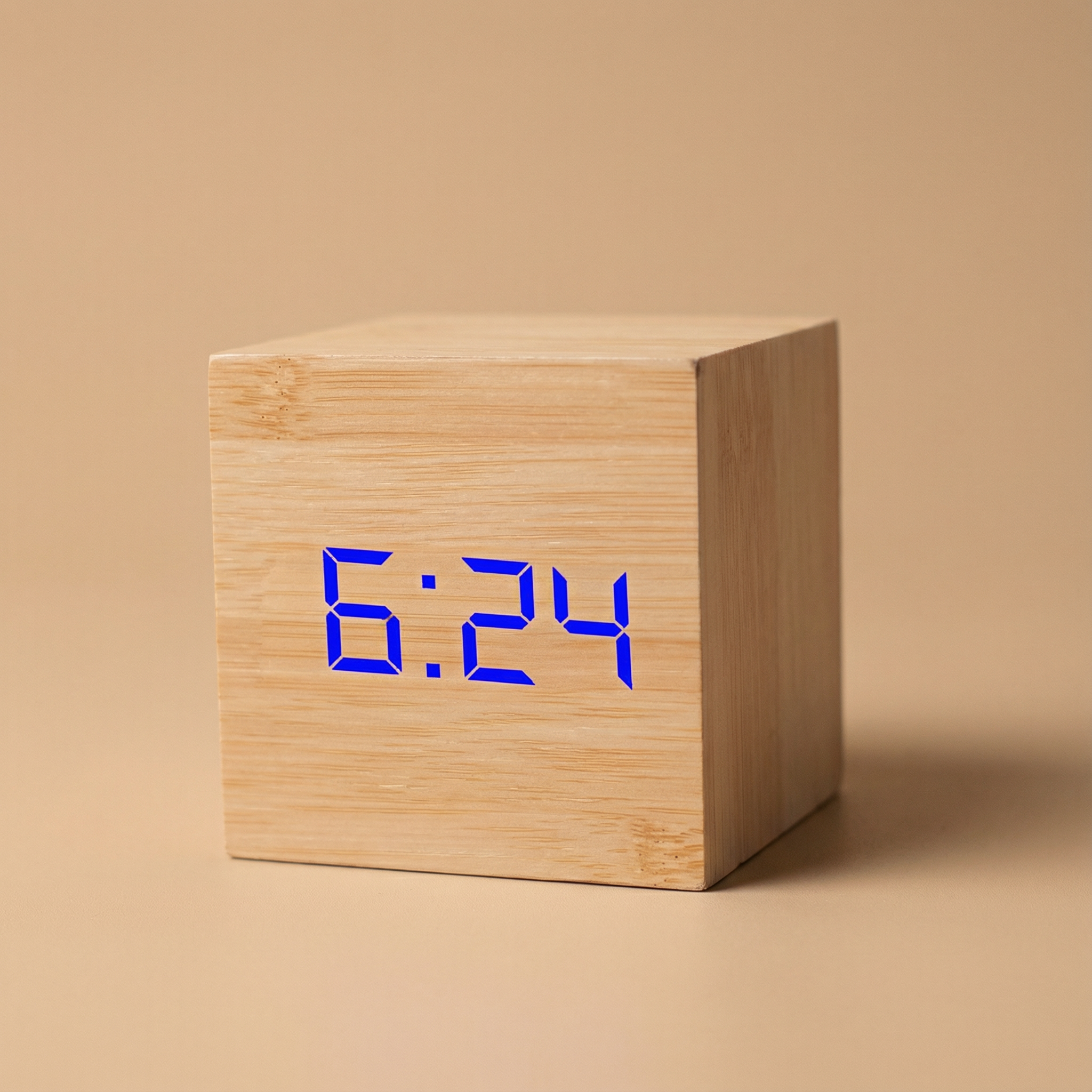 Ten sześcienny budzik LED łączy naturalną fakturę drewna z nowoczesnym, cyfrowym wyświetlaczem, tworząc subtelne i praktyczne uzupełnienie przestrzeni sypialni, biura czy salonu.