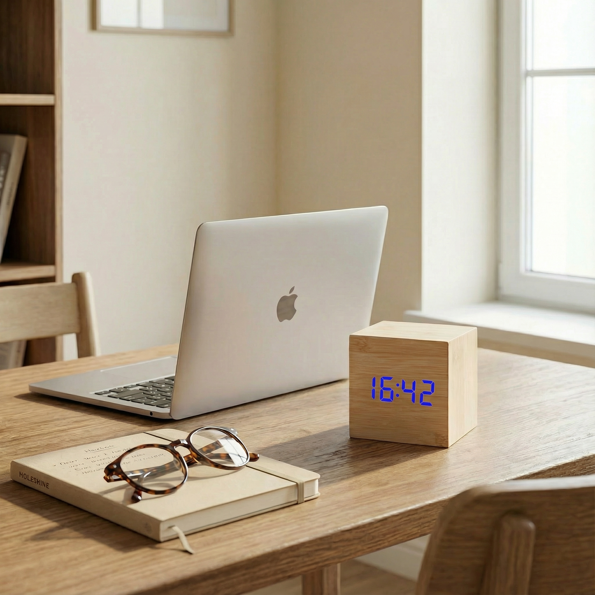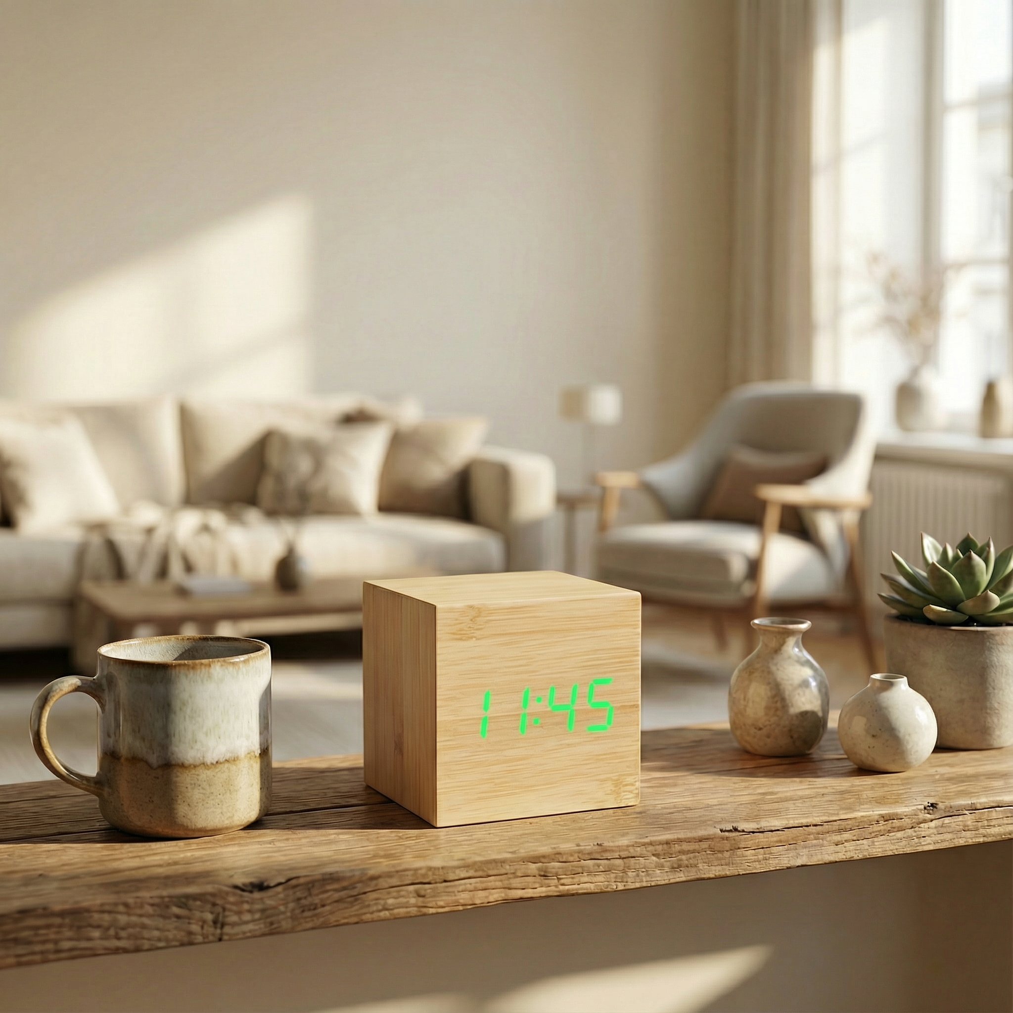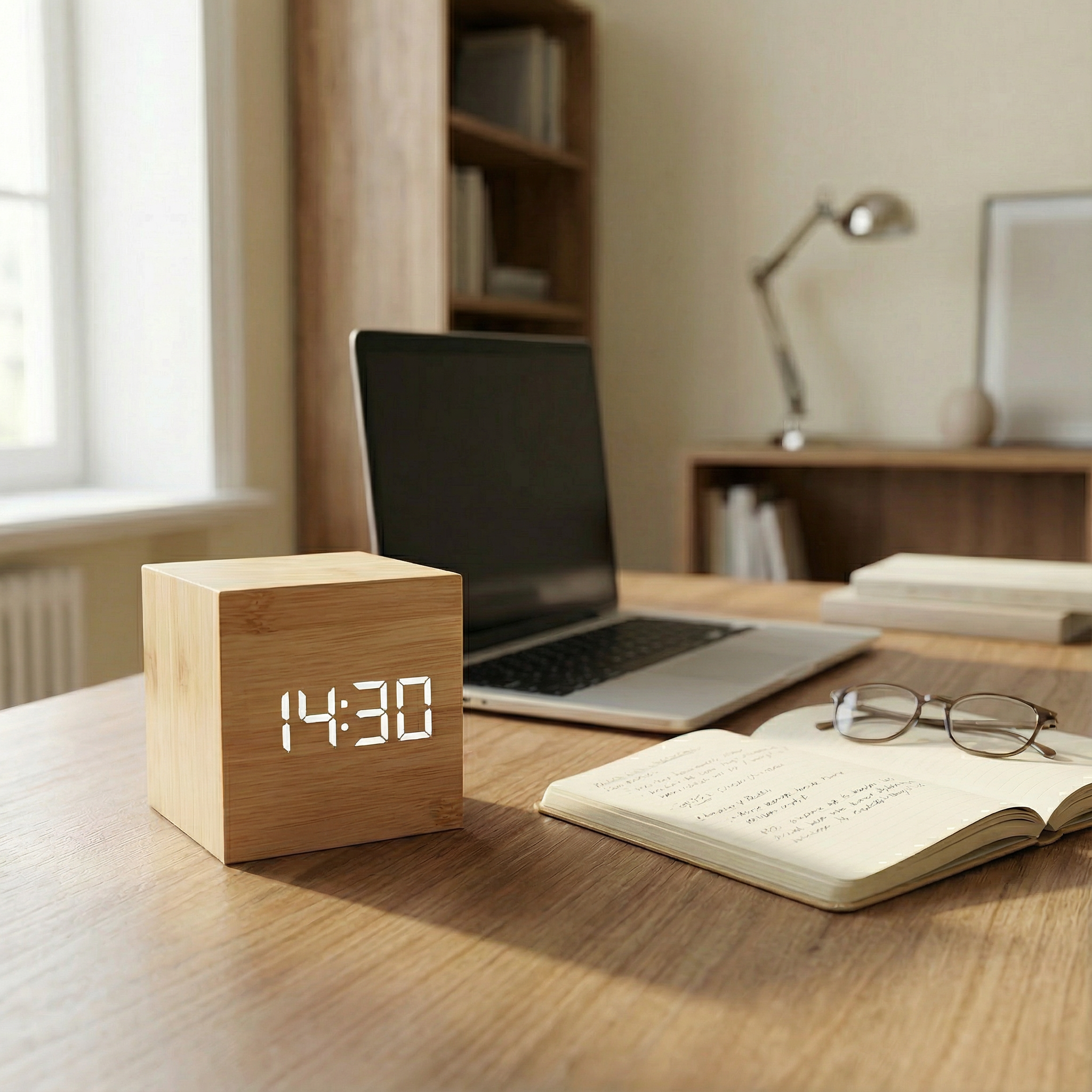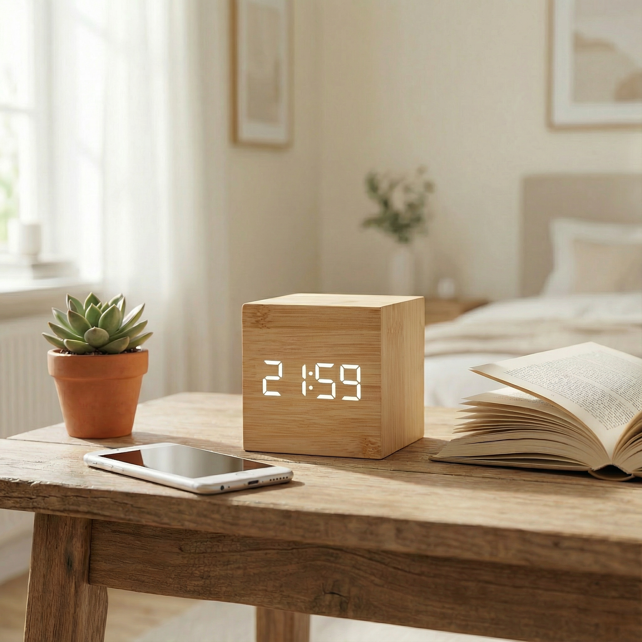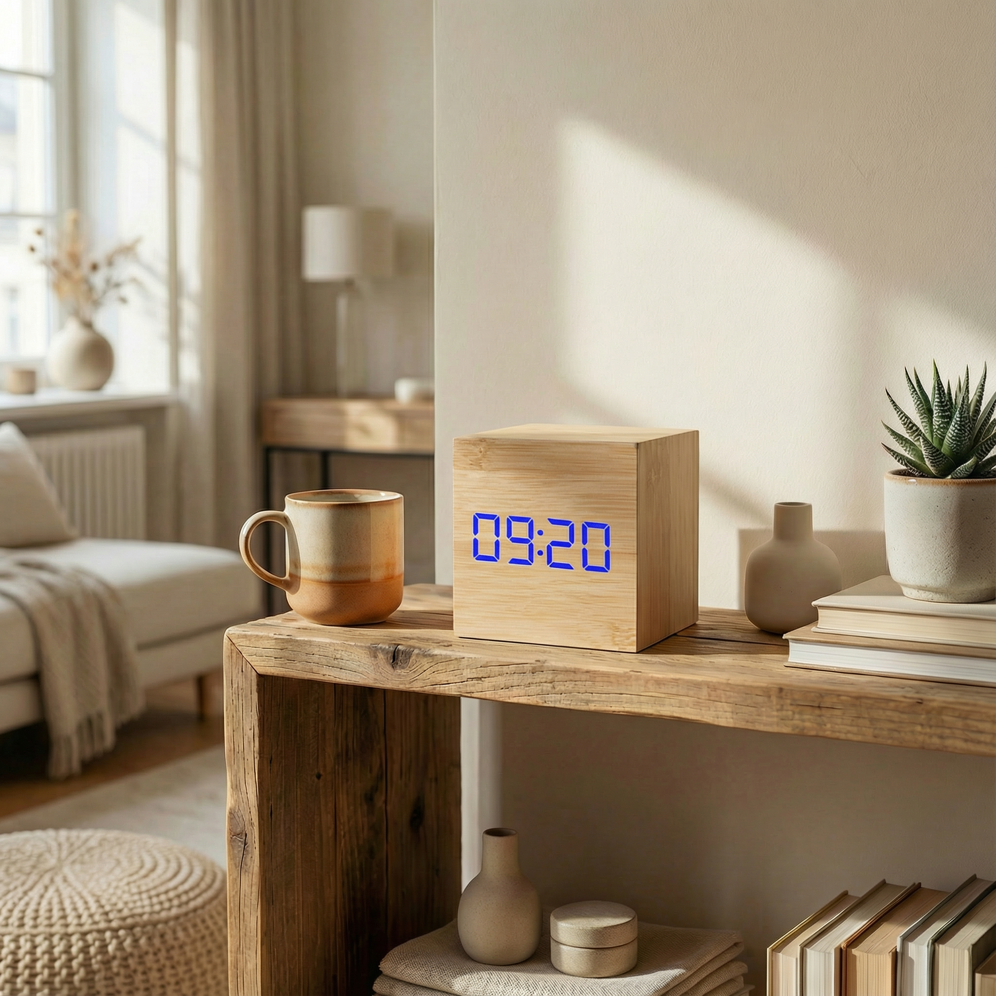 Ten sześcienny budzik LED łączy naturalną fakturę drewna z nowoczesnym, cyfrowym wyświetlaczem, tworząc subtelne i praktyczne uzupełnienie przestrzeni sypialni, biura czy salonu.