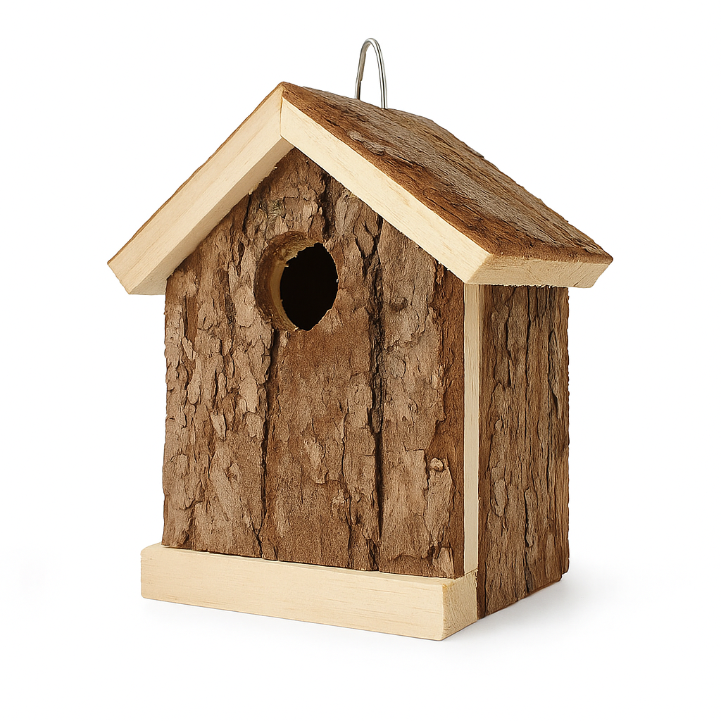 Dzięki solidnemu wykonaniu z nieobrobionego drewna i korze drzewnej, domek harmonijnie wtapia się w otoczenie. W zestawie znajduje się trwały sznurek do łatwego zawieszenia na drzewie lub ogrodzeniu. Odporny na warunki atmosferyczne, sprawdzi się przez cały rok.