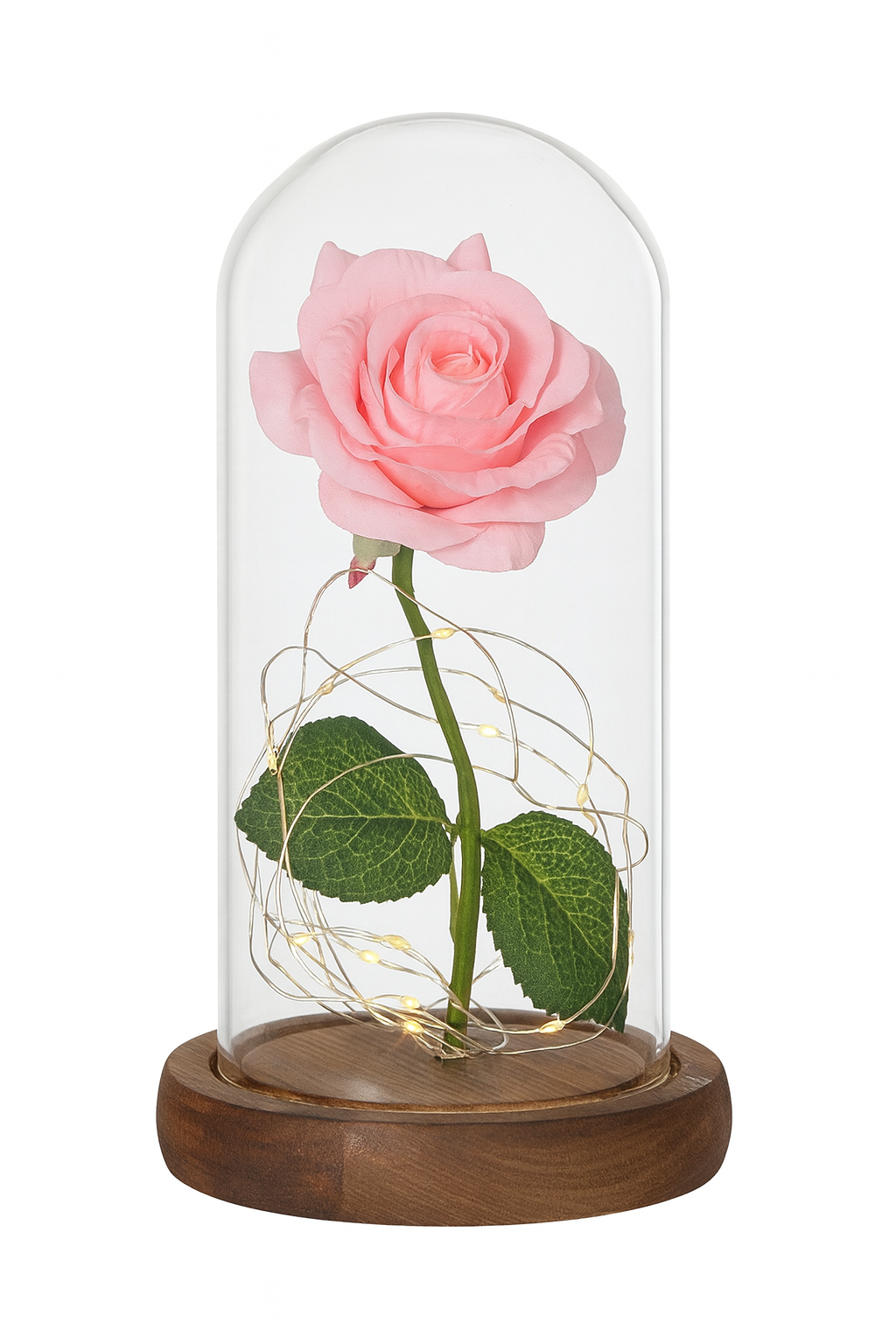 Elarosa to wieczna róża umieszczona pod szklanym kloszem, oświetlona subtelnym łańcuchem LED, który wprowadza ciepły nastrój do każdej przestrzeni.