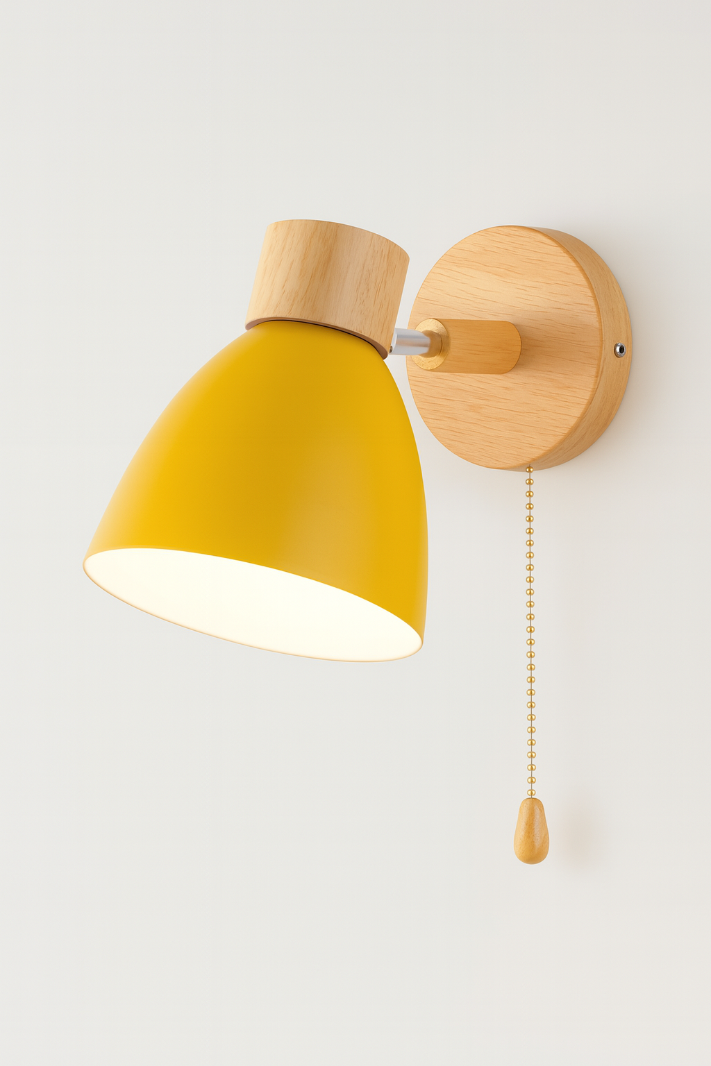 Połączenie naturalnego drewna i lakierowanego metalu tworzy harmonijny kontrast, a łańcuszkowy włącznik dodaje retro uroku i wygody użytkowania bez potrzeby wstawania z łóżka. Klosz w kształcie stożka równomiernie rozprasza światło, zapewniając łagodne oświetlenie do czytania lub wieczornego odpoczynku.