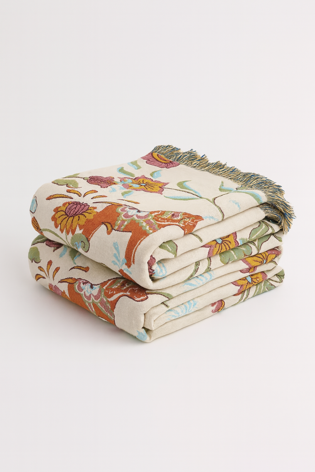 Ten bawełniany koc z florystyczno-zwierzęcym wzorem i dekoracyjnymi frędzlami to tekstylna opowieść o kolorze, przyrodzie i kreatywności.