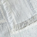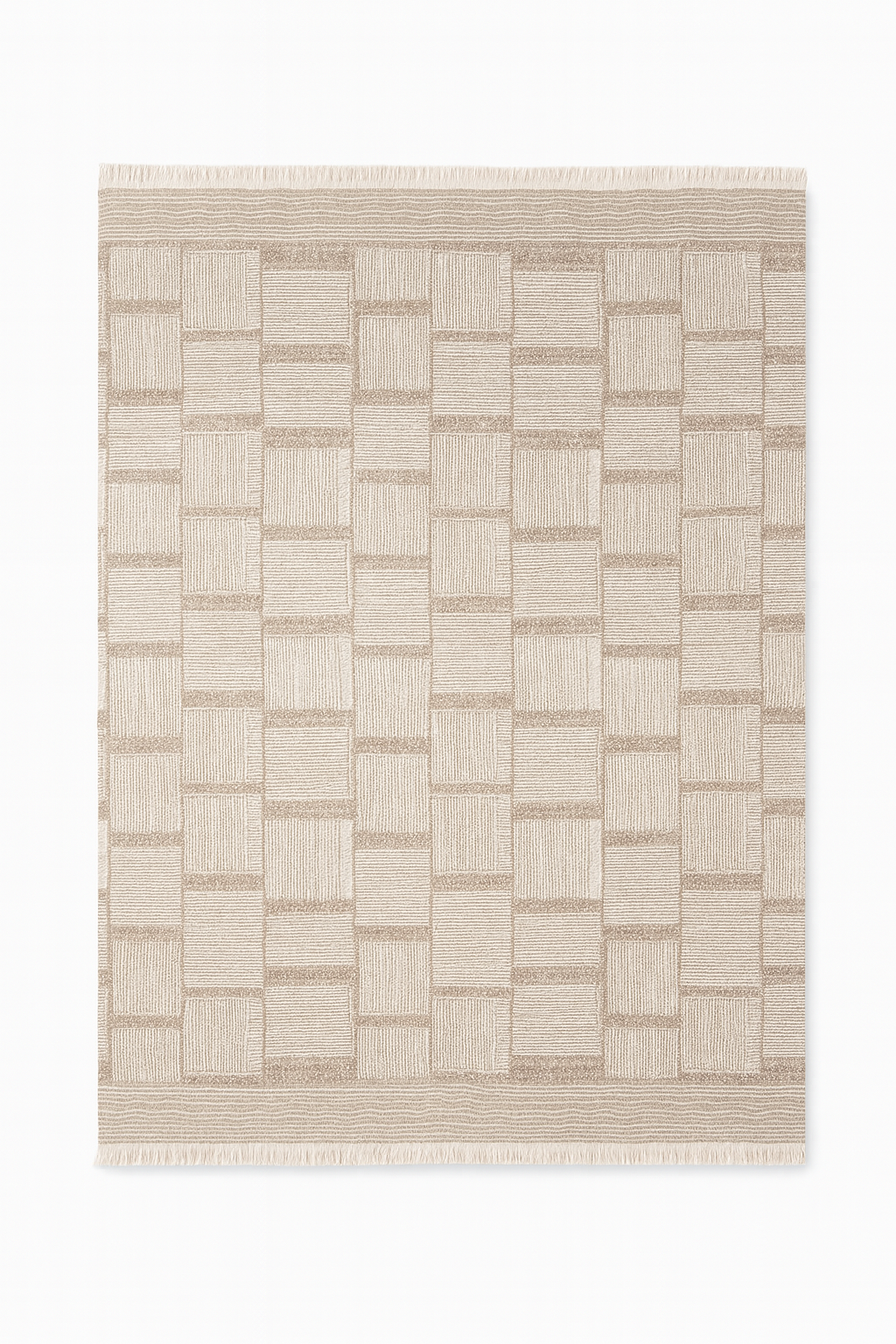 Tkany wzór bazujący na prostokątnych segmentach w odcieniach beżu i kremu wprowadza wizualną strukturę i subtelny kontrast. Wykończony delikatnymi frędzlami, koc może służyć jako narzuta na łóżko, pled na sofę lub tło dla tekstylnej stylizacji. Tkanina z naturalnej bawełny jest przyjemna w dotyku i odpowiednia do całorocznego użytku.
