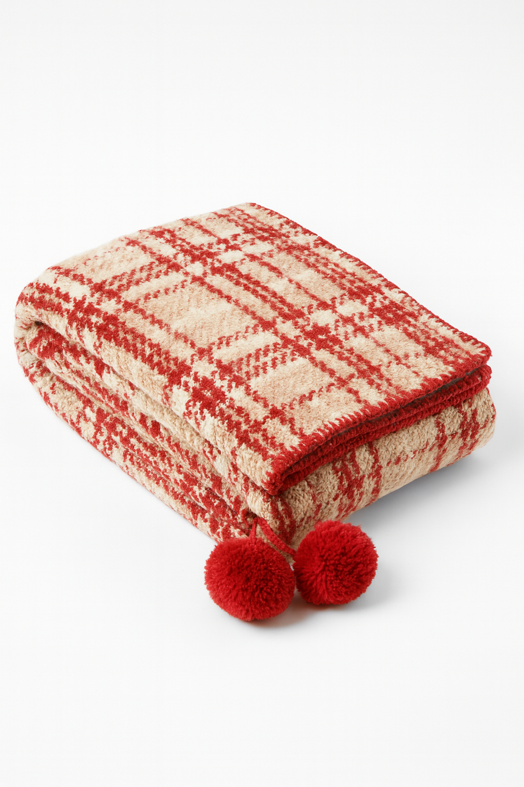Koc Snowflair łączy klasyczny motyw czerwono-białej kraty z radosnymi detalami w postaci pomponów, tworząc idealne dopełnienie zimowych aranżacji.