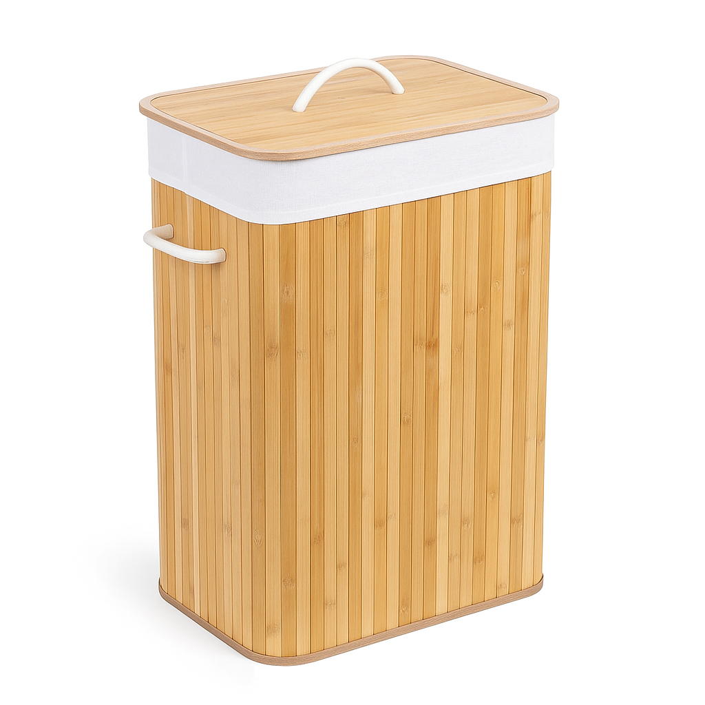 Wykonany z oddychającego bambusa i wykończony bawełnianą wyściółką, kosz posiada mocne plastikowe uchwyty po bokach. Można go z łatwością przenosić i – gdy nie jest potrzebny – złożyć na płasko. Pokrywka pomaga utrzymać porządek i estetykę w pomieszczeniu.