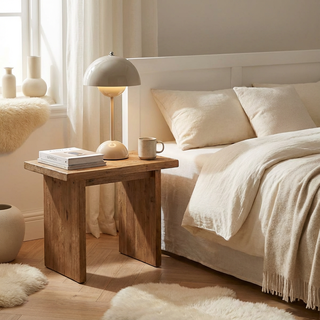 Ustaw lampę na stoliku nocnym obok minimalistycznej ceramiki – uzyskasz spójną i uspokajającą aranżację sypialni.