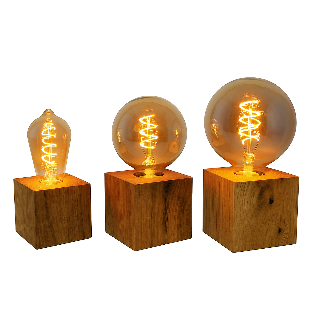 Możesz dobrać wersję z włącznikiem lub ściemniaczem oraz wybrać żarówkę w stylu Edison lub Globe. Każdy egzemplarz to unikat – wykonany z dawnych belek dębowych i idealnie wykończony. Świetnie sprawdzi się na biurku, w salonie czy przy łóżku.