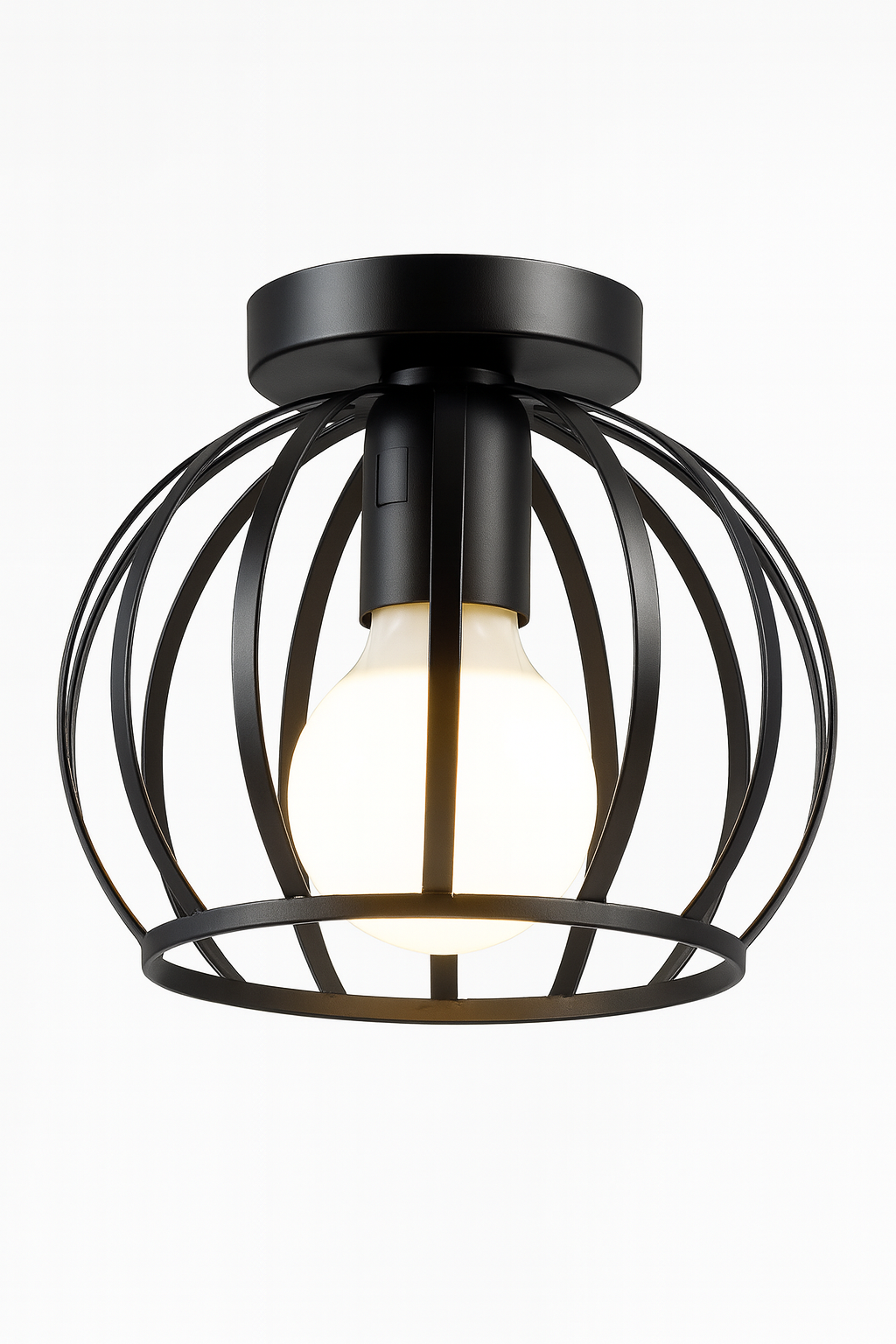 Wykonana z wytrzymałego metalu w matowej czerni, ma otwartą konstrukcję przypominającą klatkę, która nie tylko przyciąga wzrok, ale też zapewnia równomierne rozproszenie światła.