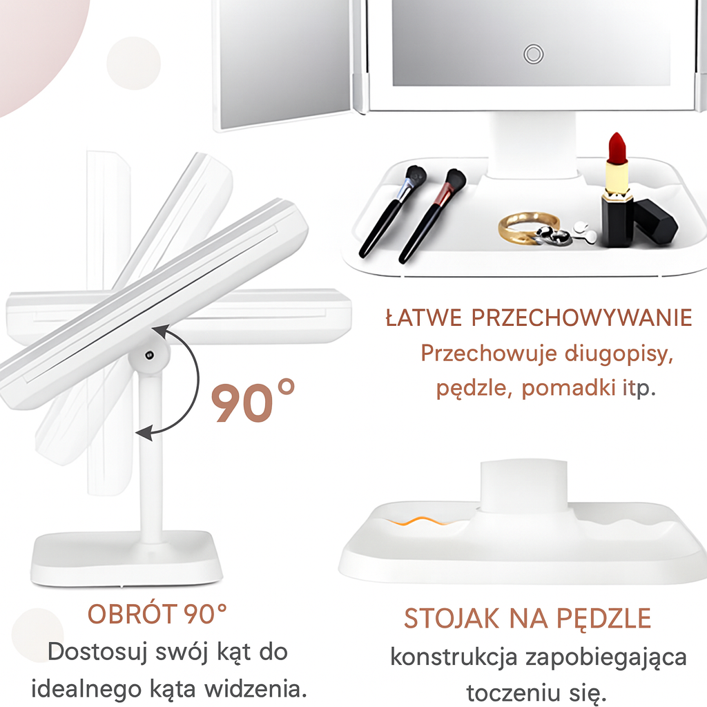 Lusterko Clara to stylowe i funkcjonalne lustro kosmetyczne z wbudowanym oświetleniem LED i potrójną powierzchnią odbijającą.