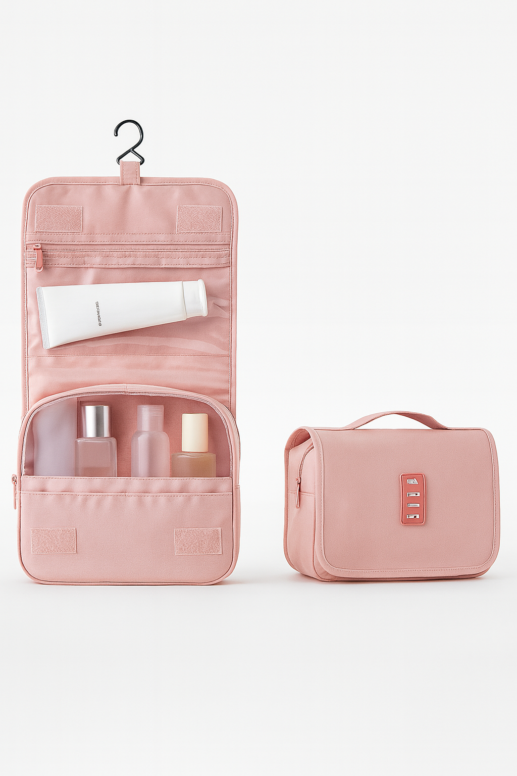 Wbudowany metalowy haczyk pozwala zawiesić kosmetyczkę w łazience, na drążku lub uchwycie walizki, co ułatwia użytkowanie w niewielkich przestrzeniach.