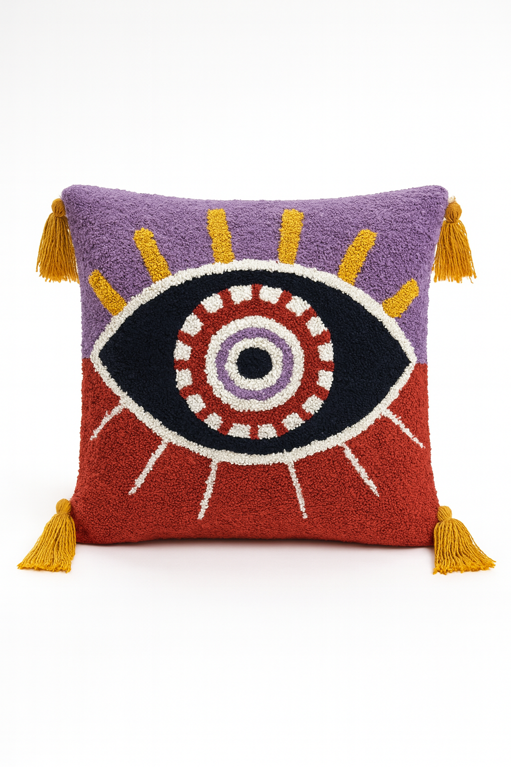 Poduszka Eyra to wyjątkowy element dekoracyjny w stylu boho, przyciągający uwagę artystycznym motywem oka. Wykonana z tkaniny zdobionej haftem pętelkowym (tufting), wyróżnia się bogatą fakturą i wyrazistymi kolorami, które nadają aranżacji energii i charakteru.