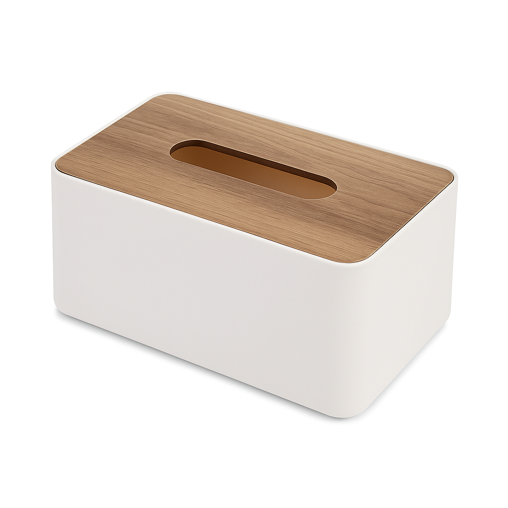 To eleganckie pudełko na chusteczki łączy gładki biały korpus z naturalną bambusową pokrywką. Styl Japandi idealnie pasuje do nowoczesnych i skandynawskich wnętrz. Owalny otwór zapewnia wygodne wyciąganie chusteczek, a kompaktowa forma idealnie wpisuje się w łazienkę, sypialnię czy biuro.