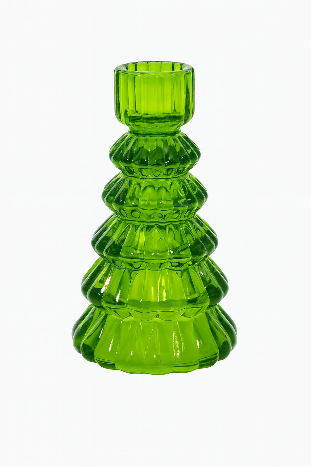 Każdy świecznik ma rzeźbioną formę przypominającą stylizowaną choinkę, a transparentna struktura szkła subtelnie rozprasza światło. Dzięki zróżnicowanej wysokości elementów zestaw tworzy zbalansowaną kompozycję na stole, komodzie lub parapecie. Idealnie pasują do świec stołowych — zarówno klasycznych kremowych, jak i złamanych pastelowych.