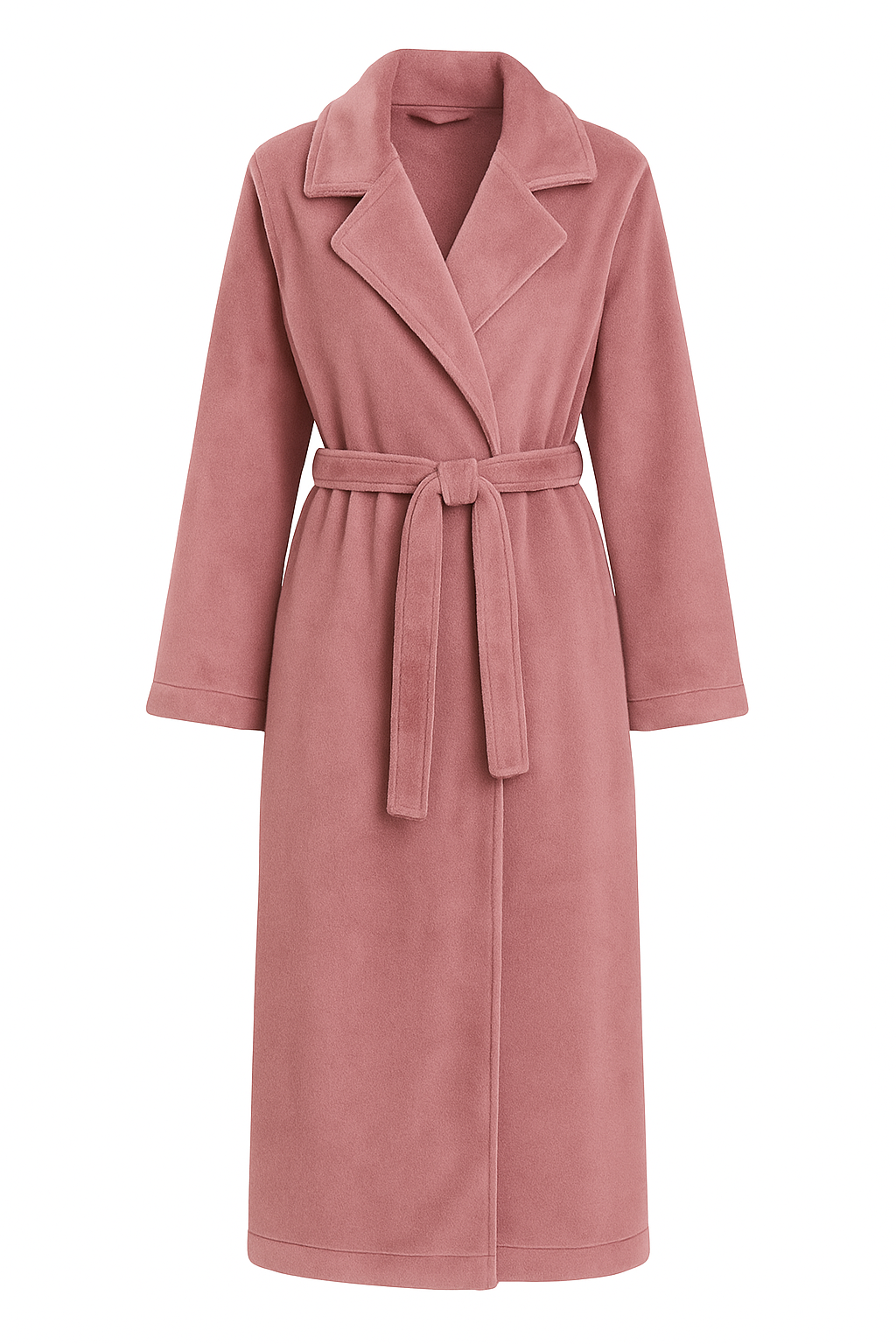Klasyczny krój z kołnierzem z klapami oraz pasek w talii pozwalają na indywidualne dopasowanie i nadają formie płaszczowego szyku.