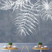 Duże białe liście palmy i paproci tworzą lekki, ilustracyjny wzór, przypominający rysunki kredą na tablicy.