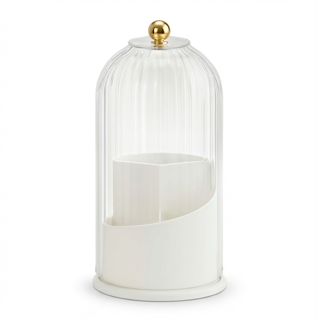 Zamknięty w przezroczystej kopule z uchylnymi drzwiczkami, chroni zawartość przed kurzem, jednocześnie eksponując pędzle w elegancki sposób. Obrotowa podstawa umożliwia łatwy dostęp do każdego elementu bez konieczności przestawiania całego pojemnika. Wnętrze z przegrodami umożliwia wygodne uporządkowanie pędzli, kredek, szminek i innych kosmetyków. Idealny do toaletek w sypialni, łazience lub salonie kosmetycznym.