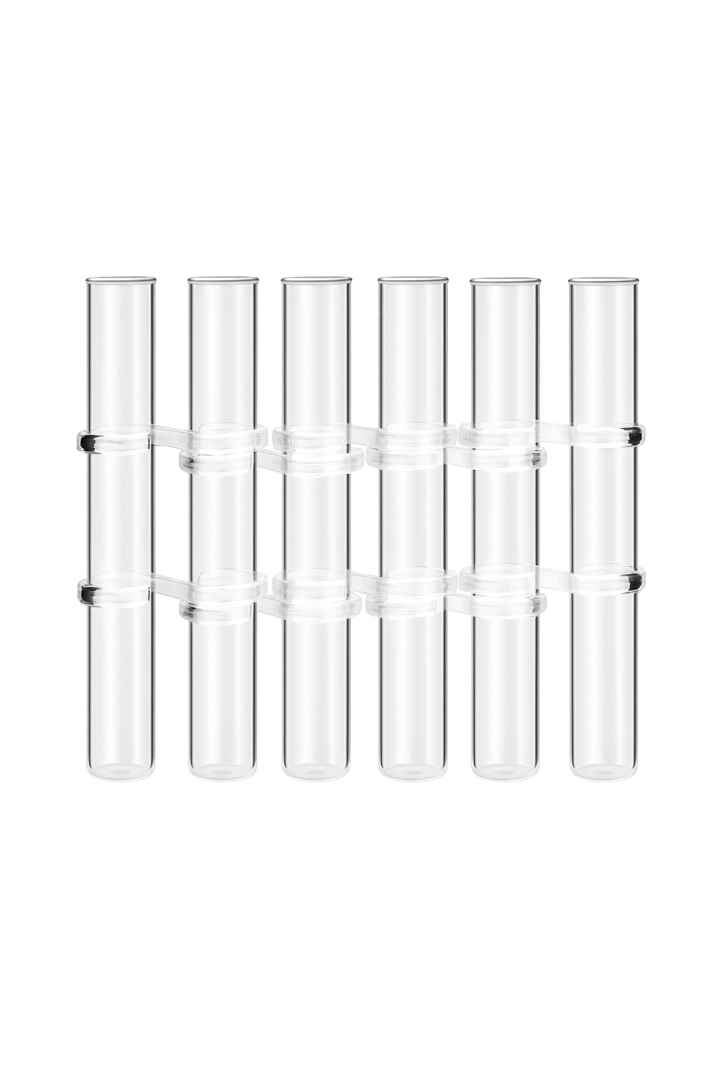 Wykonany z przezroczystego szkła borokrzemowego, wazon zachwyca lekkością i elegancją. Składa się z sześciu szklanych tub połączonych elastycznymi zawiasami, które pozwalają dowolnie zmieniać jego kształt – od prostego rzędu po krzywizny lub formy koliste. Doskonale eksponuje zarówno świeże kwiaty, jak i suche gałązki, a nawet ozdobne kompozycje z elementów sztucznych. FormiFlor to kreatywna dekoracja, która za każdym razem może wyglądać inaczej.