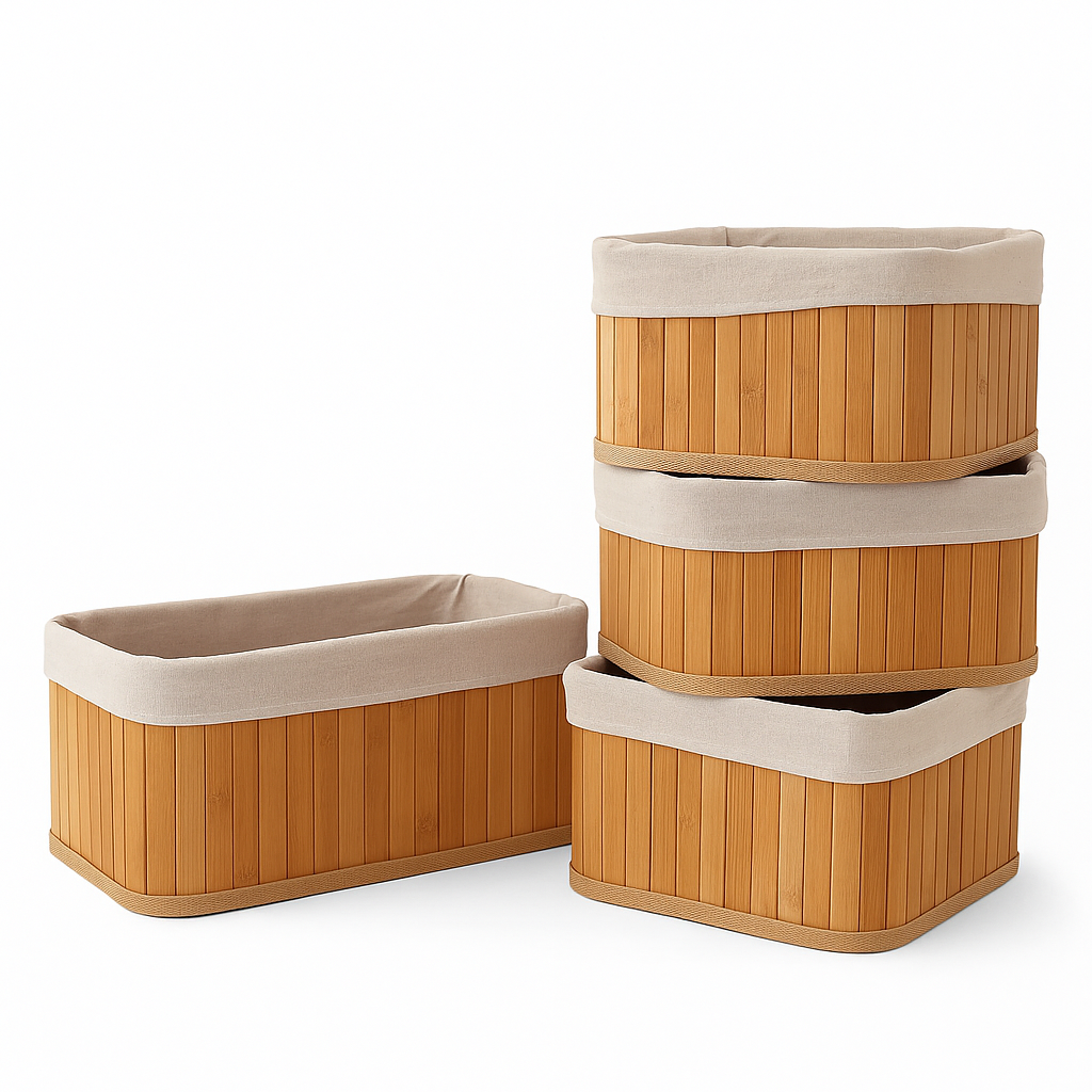 Każdy kosz wykonany jest z trwałego bambusa i wyposażony w miękką, bawełnianą wyściółkę, którą można wyjąć i wyprać. Kosze są lekkie, estetyczne i można je układać jeden na drugim — idealne do łazienki, sypialni czy garderoby.