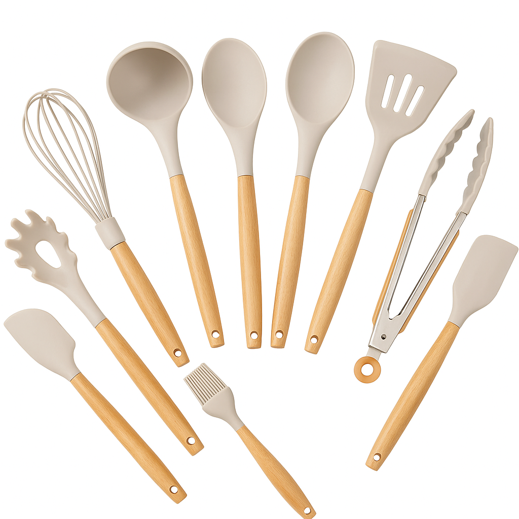 Ten piękny zestaw silikonowych narzędzi kuchennych łączy w sobie styl i funkcjonalność – idealny do każdej nowoczesnej kuchni.