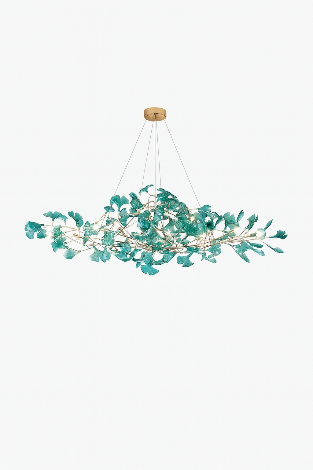 Żyrandol Ginka tworzy subtelną, świetlistą kompozycję inspirowaną naturalną formą liści miłorzębu.